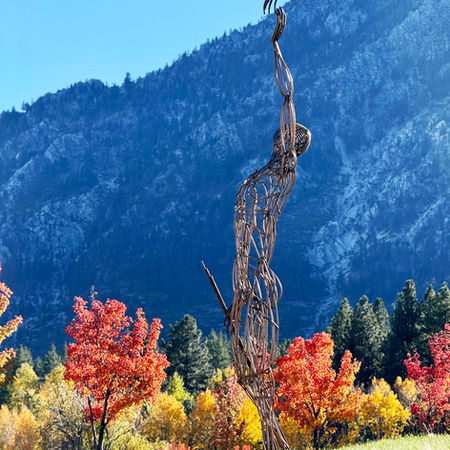 Created during a one-month invited residency at the Buffalo Creek Art Center in Gardnerville, Nevada, The Seeker stands as a monumental expression of form and spirit. Rising over 15 feet tall, the sculpture is composed of meticulously hand-formed ½-inch steel rods, each individually shaped, placed, and welded to build the figure’s structure.